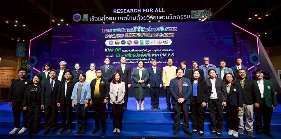 วันที่ 18 มิถุนายน 2568 สำนักงานการวิจัยแห่งชาติ(วช.) กระทรวงการอุดมศึกษา วิทยาศาสตร์ วิจัยและนวัตกรรม จัดกิจกรรม “Kick Off แผนงานเป้าหมายสำคัญตามยุทธศาสตร์ ววน. ประเด็น ประเทศไทยปลอดภัยจาก PM2.5 (เป้าหมาย 8 จังหวัดภาคเหนือตอนบน)” ภายในงาน “มหกรรมงานวิจัยแห่งชาติ 2568 (Thailand Research Expo 2025)” โดย ดร.วิภารัตน์ ดีอ่อง ผู้อำนวยการสำนักงานการวิจัยแห่งชาติ เป็นประธาน คุณศิวกร บัวป้อง รองผู้ว่าราชการจังหวัดเชียงใหม่ คุณพัชระ สิมะเสถียร รองผู้ว่าราชการจังหวัดลำปาง คุณบุญลือ ธรรมธรานุรักษ์ รองผู้ว่าราชการจังหวัดแม่ฮ่องสอน คุณคุณากร คชหิรัญ รองผู้ว่าราชการจังหวัดแพร่ คุณลักษวรรณ พวงไม้มิ่ง ผู้อำนวยการสำนักงานทรัพยากรธรรมชาติและสิ่งแวดล้อม จังหวัดพะเยา คุณศุกลรัตน์ จันทร์มณี หัวหน้าสำนักงานจังหวัดลำพูน คุณสุภาวดี ศิริวรรณ สถิติจังหวัดน่าน และคุณณิชชา ปัญญาบุญ ผู้อำนวยการส่วนอำนวยการ สำนักงานทรัพยากรธรรมชาติและสิ่งแวดล้อม จังหวัดเชียงราย ร่วมกล่าวเจตนารมณ์ความร่วมมือ โดยมีดร.ยุพิน เลิศบุรุษ ผู้อำนวยการกลุ่มขับเคลื่อนแผนงานวิจัยตามเป้าหมาย กล่าววัตถุประสงค์แผนงานฯ ณ เวที Highlight Stage โรงแรมเซ็นทาราแกรนด์ และบางกอกคอนเวนชันเซ็นเตอร์ เซ็นทรัลเวิลด์