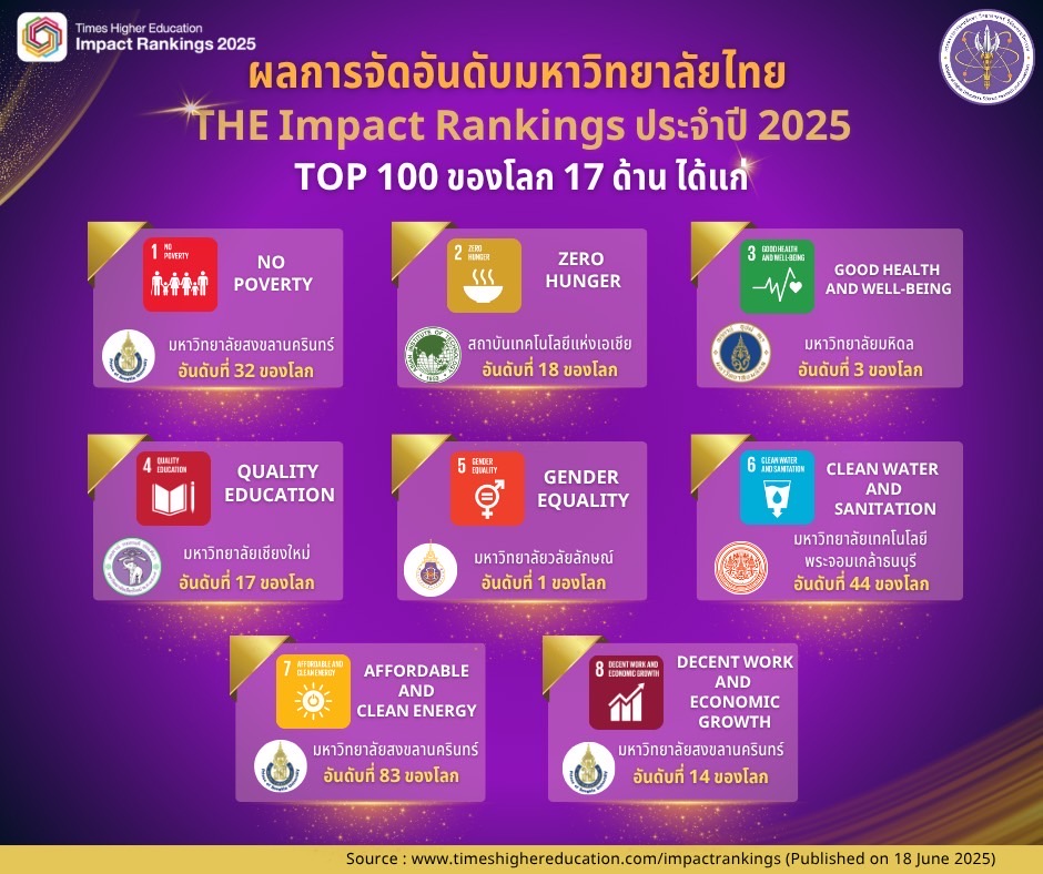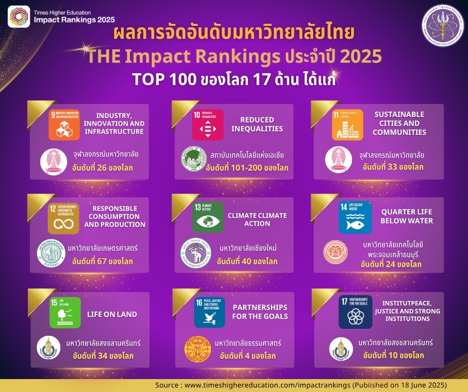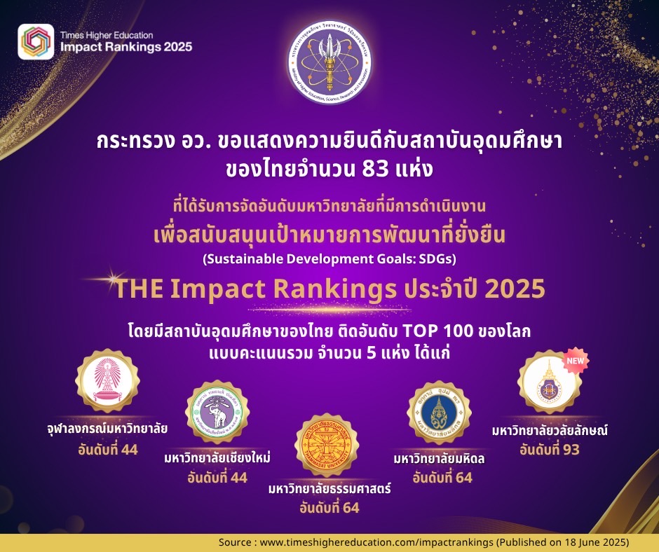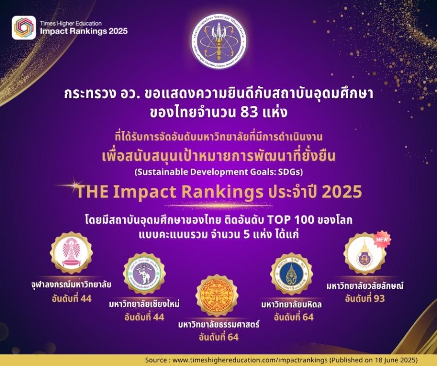 วันที่ 24 มิ.ย. ศ.ดร.ศุภชัย ปทุมนากุล ปลัดกระทรวงการอุดมศึกษา วิทยาศาสตร์ วิจัยและนวัตกรรม (อว.) เปิดเผยว่า Times Higher Education (THE) หน่วยงานด้านการจัดอันดับสถาบันอุดมศึกษาชั้นนำของโลก ได้ประกาศผลการจัดอันดับสถาบันอุดมศึกษาที่มีการดำเนินงานเพื่อสนับสนุนเป้าหมายการพัฒนาที่ยั่งยืน (Sustainable Development Goals: SDGs) หรือ THE Impact Rankings ประจำปี 2568 โดยในปีนี้มีสถาบันอุดมศึกษาทั่วโลก เข้าร่วมการจัดอันดับทั้งหมด 2526 แห่ง จาก 130 ประเทศและเขตเศรษฐกิจทั่วโลก และมีสถาบันอุดมศึกษาไทยเข้ารับการจัดอันดับทั้งสิ้น 83 แห่ง เพิ่มจากปี 2567 ซึ่งมีจำนวน 77 แห่ง ซึ่งผลการจัดอันดับปรากฎว่า มี 5 สถาบันอุดมศึกษาไทยอยู่ในอันดับ Top 100 ของโลก แบบคะแนนรวม ได้แก่ จุฬาลงกรณ์มหาวิทยาลัยและมหาวิทยาลัยเชียงใหม่ อันดับที่ 44 มหาวิทยาลัยมหิดลและมหาวิทยาลัยธรรมศาสตร์ อันดับที่ 64 และมีมหาวิทยาลัยวลัยลักษณ์ อันดับที่ 93 ซึ่งขยับมาอยู่ในอันดับ Top 100 เป็นปีแรก อีกทั้งยังเป็นสถาบันอุดมศึกษาอันดับ 1 ของโลกที่ได้รับคะแนนสูงสุดในการดำเนินงาน SDGs เป้าหมายที่ 5 ความเท่าเทียมทางเพศ (Gender equality) นอกจากนี้ ยังมีสถาบันอุดมศึกษาไทยอีกหลายแห่งที่ได้รับการจัดอันดับที่ 101-200 ของโลก ได้แก่ สถาบันเทคโนโลยีแห่งเอเชีย (AIT) มหาวิทยาลัยเกษตรศาสตร์มหาวิทยาลัยขอนแก่น มหาวิทยาลัยเทคโนโลยีพระจอมเกล้าธนบุรี และมหาวิทยาลัยสงขลานครินทร์