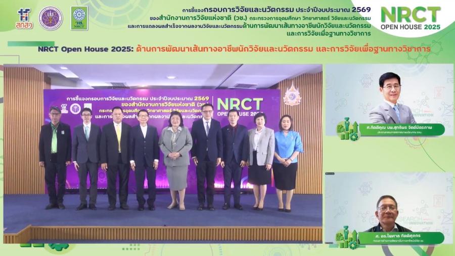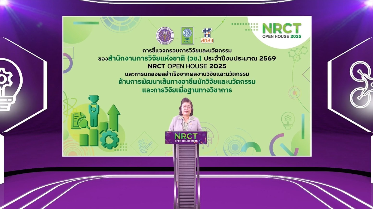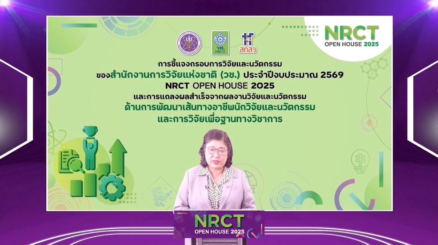 วันที่ 25 มิถุนายน พ.ศ. 2568 สำนักงานการวิจัยแห่งชาติ (วช.) กระทรวงการอุดมศึกษา วิทยาศาสตร์ วิจัยและนวัตกรรม จัดกิจกรรมเปิดบ้านชี้แจงกรอบการวิจัยและนวัตกรรม ประจำปีงบประมาณ 2569 (NRCT Open House 2025) และการแถลงผลสำเร็จจากผลงานวิจัยและนวัตกรรม ”ด้านการพัฒนาเส้นทางอาชีพนักวิจัยและนวัตกรรม และการวิจัยเพื่อฐานทางวิชาการ” โดยมี ดร.วิภารัตน์ ดีอ่อง ผู้อำนวยการสำนักงานการวิจัยแห่งชาติ เป็นประธานเปิดงาน โดยมีผู้เข้าร่วมรับฟังทั้งจากหน่วยงานภาครัฐ ภาคเอกชน สถาบันการศึกษา นักวิจัย ตลอดจนผู้สนใจด้านการวิจัยและนวัตกรรมเข้าร่วม ณ ห้องประชุมจอมพลสฤษดิ์ ธนะรัชต์ ชั้น 2 อาคาร วช.1