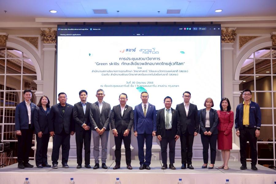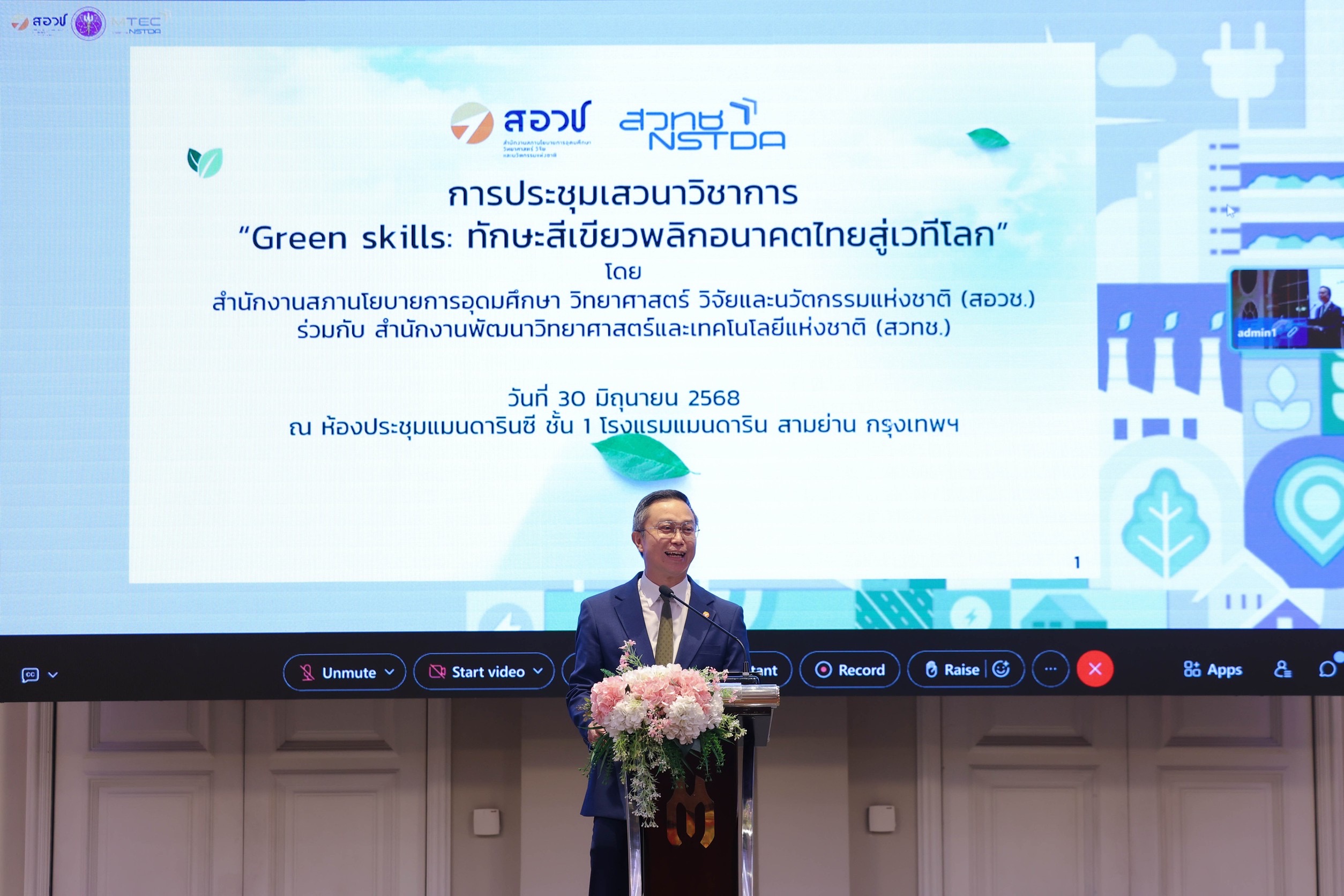 สำนักงานสภานโยบายการอุดมศึกษา วิทยาศาสตร์ วิจัยและนวัตกรรมแห่งชาติ (สอวช.) ร่วมกับ สำนักงานพัฒนาวิทยาศาสตร์และเทคโนโลยีแห่งชาติ (สวทช.) จัดการประชุมเสวนาวิชาการ “Green skills: ทักษะสีเขียวพลิกอนาคตไทยสู่เวทีโลก” เมื่อวันที่ 30 มิถุนายน 2568 ณ ห้องประชุมแมนดารินซี ชั้น 1 โรงแรมแมนดาริน สามย่าน กรุงเทพฯ โดยมี ดร.สุรชัย สถิตคุณรัตน์ ผู้อำนวยการ สอวช. กล่าวเปิดงาน