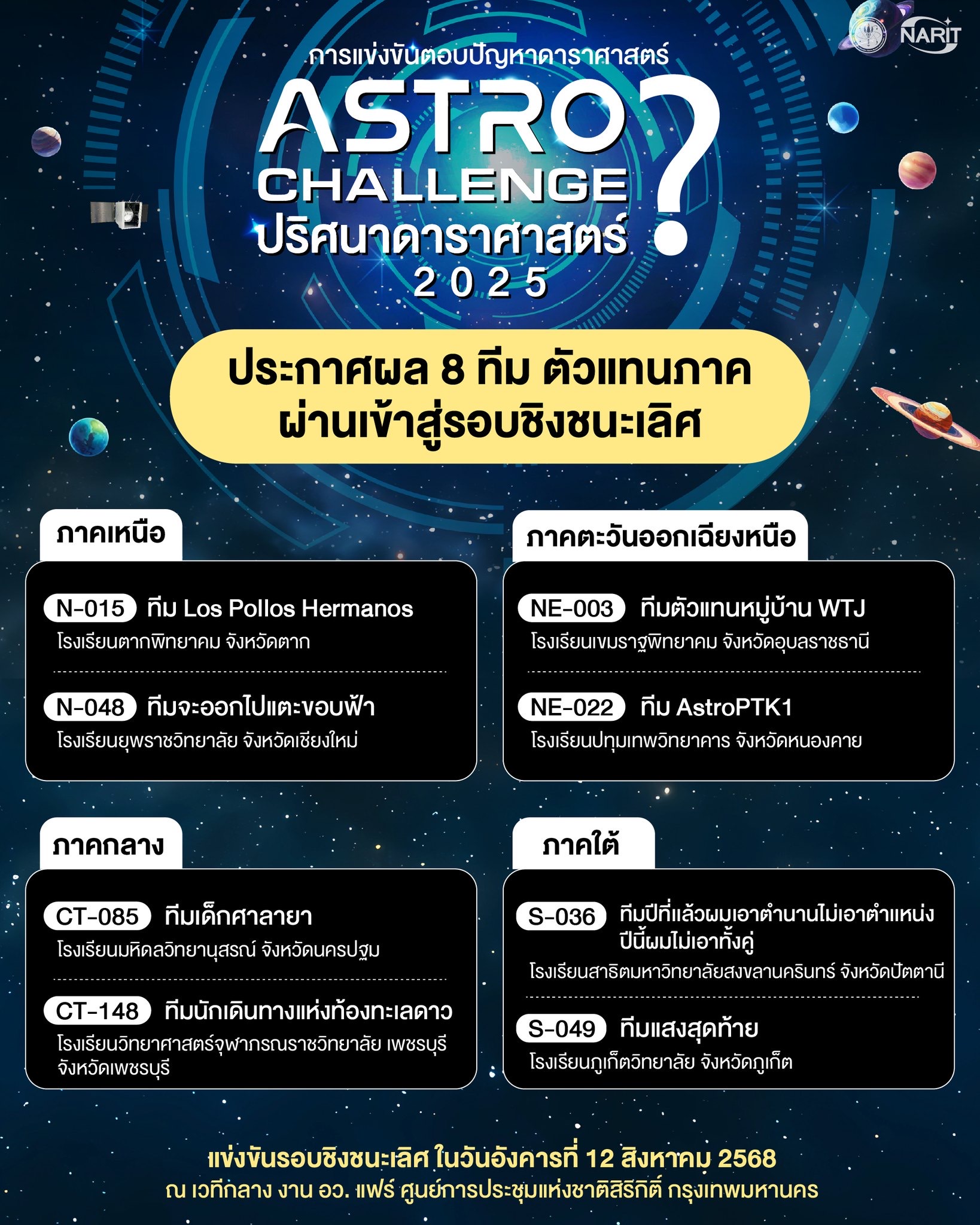กิจกรรมแข่งขันตอบปัญหาดาราศาสตร์ “Astro Challenge: ปริศนาดาราศาสตร์” ในปีนี้ ได้รับความสนใจอย่างล้นหลาม มีเยาวชนระดับมัธยมศึกษาจากทั่วประเทศสมัครเข้าร่วมแข่งขันมากถึง 1088 ทีม รวมกว่า 3264 คน จัดการแข่งขันในรูปแบบทีม ทีมละ 3 คน โดยรอบคัดเลือกจัดขึ้นเมื่อวันเสาร์ที่ 21 มิถุนายน 2568 ที่ผ่านมา เฟ้นหาตัวแทนจาก 4 ภูมิภาค ได้แก่ ภาคเหนือ ภาคตะวันออกเฉียงเหนือ ภาคกลาง และภาคใต้ ภูมิภาคละ 2 ทีม รวมเป็น 8 ทีมสุดท้าย เพื่อเข้าแข่งขันในรอบชิงชนะเลิศซึ่งทีมที่ได้รับคะแนนสูงสุดของแต่ละภูมิภาคผ่านเข้าสู่รอบชนะเลิศมีดังนี้