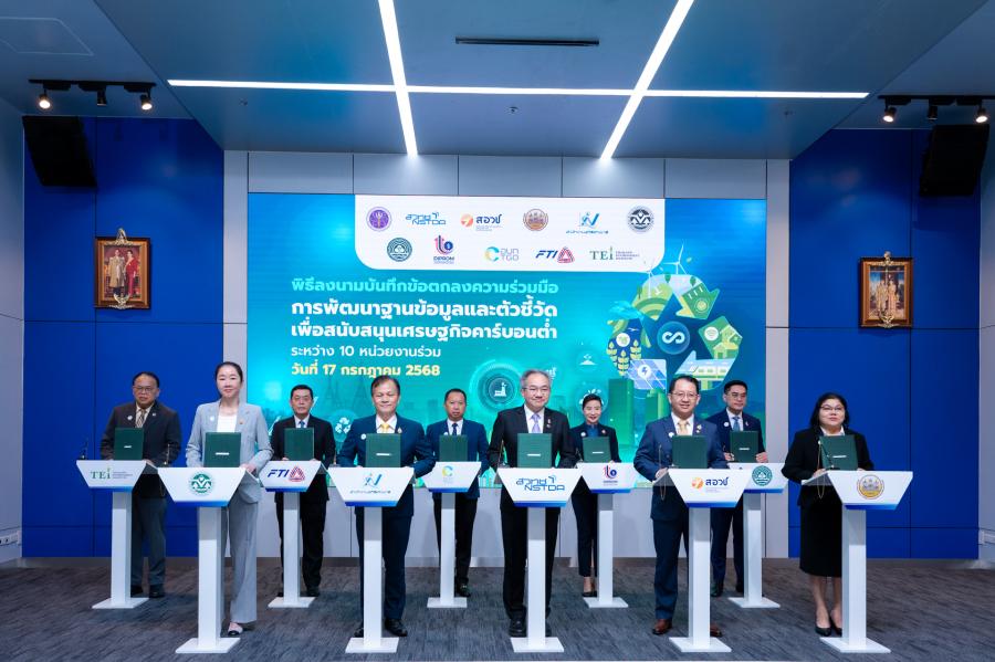 วันที่ 17 กรกฎาคม 2568 ที่ห้องแถลงข่าว ชั้น 1 อาคารพระจอมเกล้า กระทรวงการอุดมศึกษา วิทยาศาสตร์ วิจัยและนวัตกรรม ถนนพระราม 6 กรุงเทพฯ: ศาสตราจารย์ ดร.ชูกิจ ลิมปิจำนงค์ ผู้อำนวยการสำนักงานพัฒนาวิทยาศาสตร์และเทคโนโลยีแห่งชาติ (สวทช.) พร้อมด้วย รองศาสตราจารย์ ดร.เติมศักดิ์ ศรีคิรินทร์ ผู้อำนวยการศูนย์เทคโนโลยีโลหะและวัสดุแห่งชาติ สังกัดกระทรวงการอุดมศึกษา วิทยาศาสตร์ วิจัยและนวัตกรรม (อว.) ลงนามบันทึกข้อตกลง “ความร่วมมือการพัฒนาฐานข้อมูลและตัวชี้วัดเพื่อสนับสนุนเศรษฐกิจคาร์บอนต่ำ” ร่วมกับผู้บริหารจาก 9 หน่วยงาน ประกอบด้วย รองศาสตราจารย์ วงกต วงศ์อภัย รองผู้อำนวยการสำนักงานสภานโยบายการอุดมศึกษา วิทยาศาสตร์ วิจัยและนวัตกรรมแห่งชาติ (สอวช.) นายดนุชา พิชยนันท์ เลขาธิการสภาพัฒนาการเศรษฐกิจและสังคมแห่งชาติ (สศช.) นายภุชพงค์ โนดไธสง ผู้อำนวยการสำนักงานสถิติแห่งชาติ (สสช.) ดร.ชญานันท์ ภักดีจิตต์ เลขาธิการสำนักงานนโยบายและแผนทรัพยากรธรรมชาติและสิ่งแวดล้อม(สผ.) ดร.พิรุณ สัยยะสิทธิ์พานิช อธิบดีกรมการเปลี่ยนแปลงสภาพภูมิอากาศและสิ่งแวดล้อม (สส.) นางสาวณัฏฐิญา เนตยสุภา อธิบดีกรมส่งเสริมอุตสาหกรรม (กสอ.) นายณกรณ์ ตรรกวิรพัท ผู้อำนวยการองค์การบริหารจัดการก๊าซเรือนกระจก (องค์การมหาชน) (อบก.) นายกิตติพงศ์ ลิ่มสุวรรณโรจน์ กรรมการบริหารสถาบันการเปลี่ยนแปลงสภาพภูมิอากาศ สภาอุตสาหกรรมแห่งประเทศไทย (ส.อ.ท.) และ ดร.วิจารย์ สิมาฉายา ผู้อำนวยการมูลนิธิสถาบันสิ่งแวดล้อมไทย (มสท.)