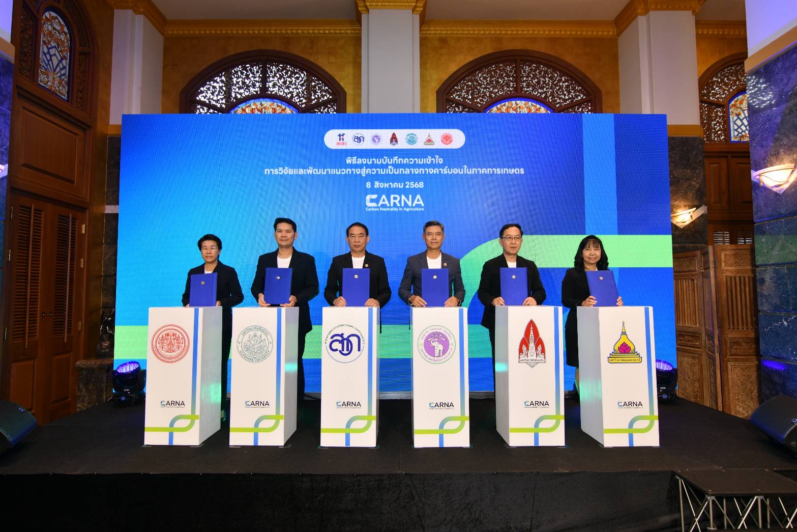 เมื่อวันที่ 8 ส.ค. 2568 สำนักงานพัฒนาการวิจัยการเกษตร (องค์การมหาชน) (สวก.) มหาวิทยาลัยเชียงใหม่ (มช.) และเครือข่าย ร่วมจัดพิธีลงนามบันทึกความเข้าใจ “การวิจัยและพัฒนาแนวทางสู่ความเป็นกลางทางคาร์บอนในภาคการเกษตร ” ระหว่างสำนักงานพัฒนาการวิจัยการเกษตร (องค์การมหาชน) มหาวิทยาลัยเชียงใหม่(มช.) มหาวิทยาลัยขอนแก่น (มข.) มหาวิทยาลัยศิลปากร (มศก.) มหาวิทยาลัยอุบลราชธานี (ม.อบ.) และมหาวิทยาลัยเทคโนโลยีพระจอมเกล้าธนบุรี (มจธ.) โดยมี ดร.วิชาญ อิงศรีสว่าง ผอ.สวก. ศ.ดร.นพ.พงษ์รักษ์ ศรีบัณฑิตมงคล อธิการบดี มช. รศ.นพ.ชาญชัย พานทองวิริยะกุล อธิการบดี มข. ศ.ดร.ธนะเศรษฐ์ ง้าวหิรัญพัฒน์ อธิการบดี มศก. รศ.ดร.ชุตินันท์ ประสิทธิ์ภูริปรีชา อธิการบดี ม.อบ. และ รศ.ดร.สุวิทย์ แซ่เตีย อธิการบดี มจธ. ตลอดจนผู้บริหาร ผู้แทนจากมหาวิทยาลัยและหน่วยงานพันธมิตรเข้าร่วม ณ ห้องรัตนโกสินทร์ ชั้น 1 โรงแรมเดอะ สุโกศล กรุงเทพฯ