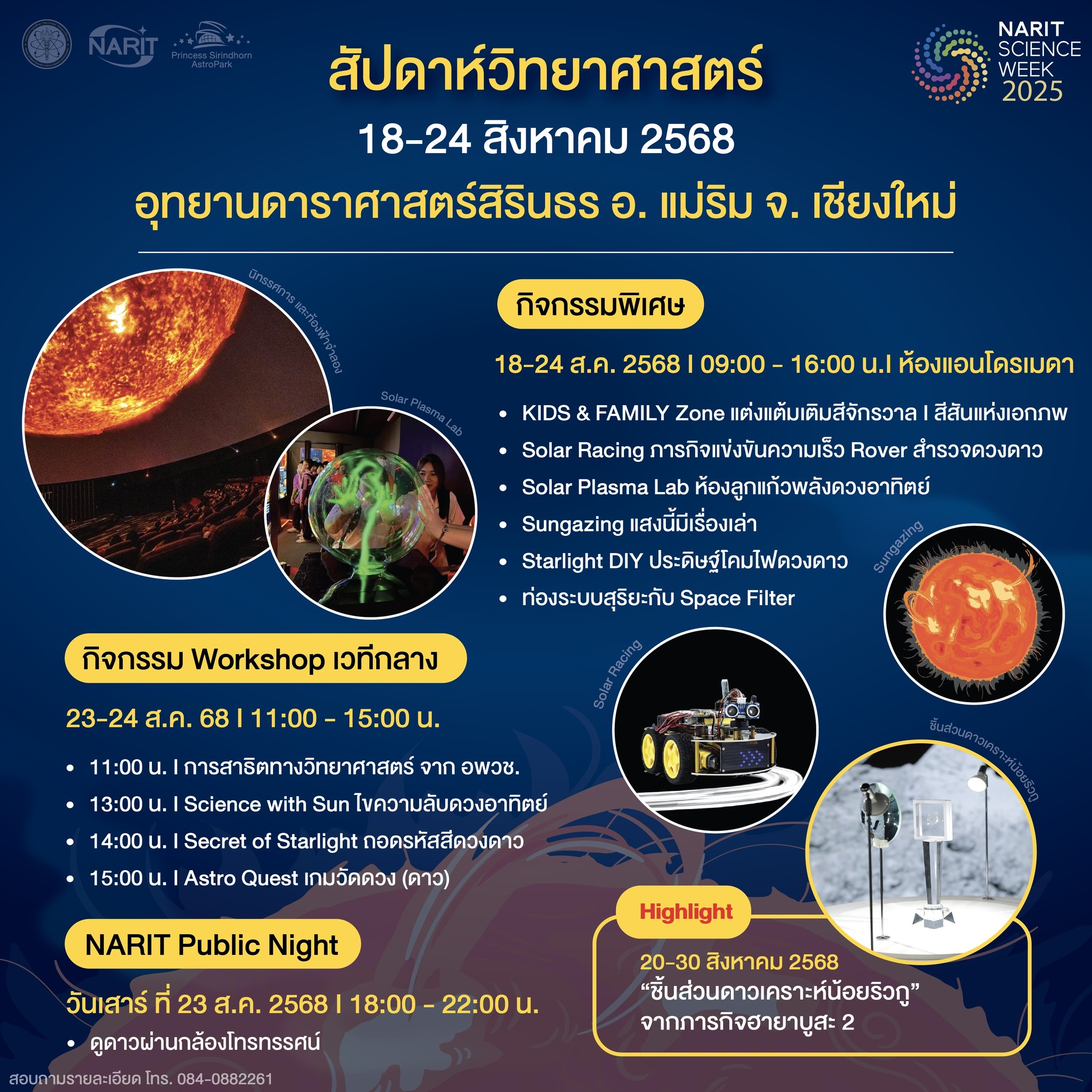 อุทยานดาราศาสตร์สิรินธร อ. แม่ริม จ. เชียงใหม่ : ปีนี้จัดขึ้นภายใต้คอนเซปต์ “Science with Sun” สนุกกับ Walk Rally นิทรรศการดาราศาสตร์และจัตุรัสวิทยาศาสตร์ อพวช.เชียงใหม่ เปิดประสบการณ์เรียนรู้เรื่องดวงอาทิตย์อย่างใกล้ชิด ผ่านกิจกรรมแบบลงมือทำจริง อาทิ Solar Racing ภารกิจแข่งขันความเร็ว Rover สำรวจดวงดาว Solar Plasma Lab ห้องลูกแก้วพลังดวงอาทิตย์ Sungazing แสงนี้มีเรื่องเล่า Starlight DIY ประดิษฐ์โคมไฟดวงดาว และท่องระบบสุริยะกับ Space Filter เพลิดเพลินกับโซน KIDS & FAMILY กับกิจกรรมแต่งแต้มเติมสีจักรวาล และสีสันแห่งเอกภพ พร้อมพาเหรดเวิร์กช็อปวันที่ 23-24 ส.ค. 68 ณ เวทีกลาง ได้แก่ Secret of Starlight ถอดรหัสสีดวงดาว Science with Sun ไขความลับดวงอาทิตย์ Astro Quest เกมวัดดวง (ดาว) และโชว์วิทยาศาสตร์สุดตื่นเต้น