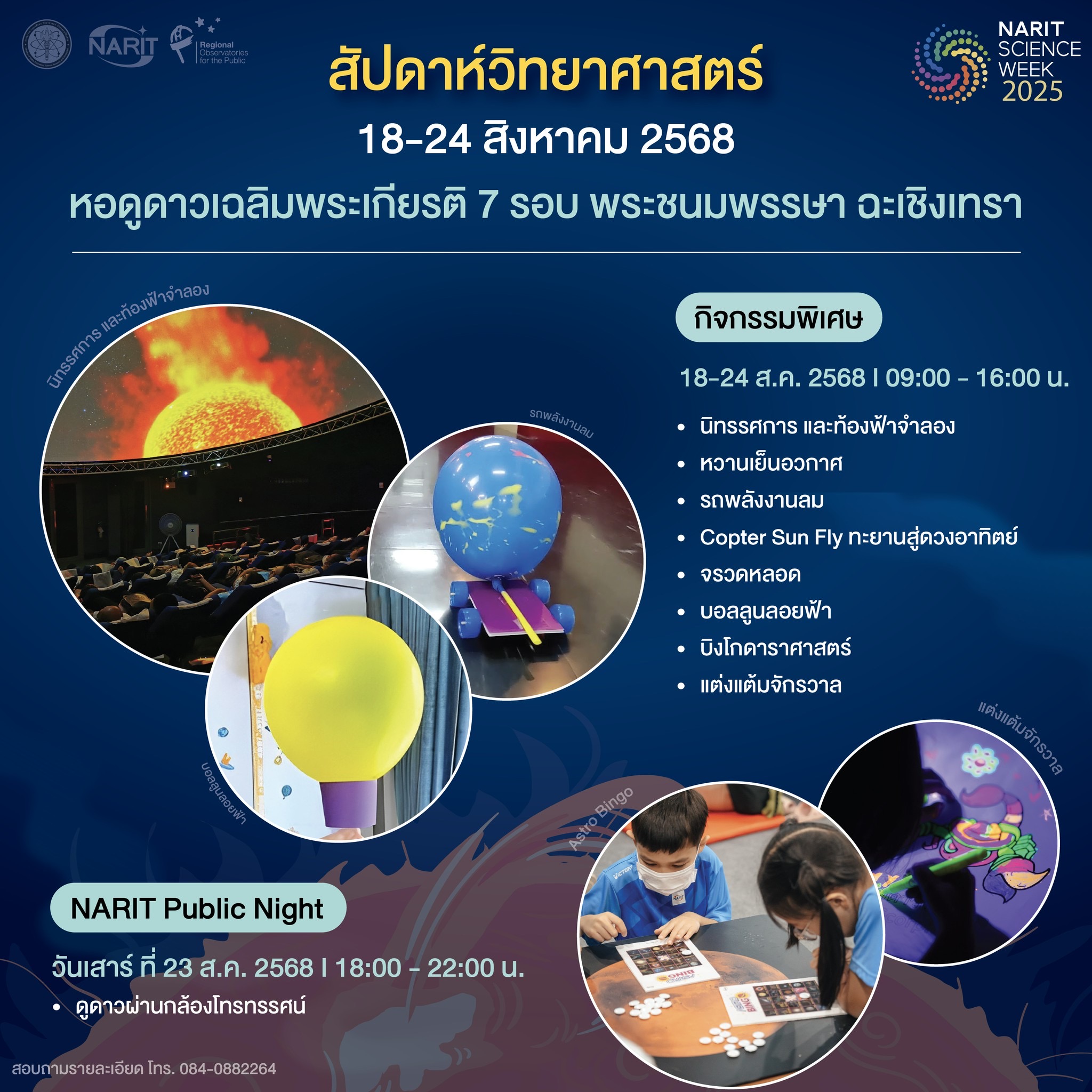 เนื่องในโอกาสวันวิทยาศาสตร์แห่งชาติ สดร. กำหนดจัดงาน “NARIT Science Week 2025” สัปดาห์วิทยาศาสตร์ประจำปี 2568 ระหว่างวันที่ 18-24 สิงหาคม 2568 เวลา 09:00-17:00 น. ระดมทีมจัดกิจกรรมดาราศาสตร์และวิทยาศาสตร์พร้อมกัน 5 แห่งทั่วประเทศ ณ อุทยานดาราศาสตร์สิรินธร อ. แม่ริม จ. เชียงใหม่ หอดูดาวเฉลิมพระเกียรติ 7 รอบ พระชนมพรรษา นครราชสีมา ขอนแก่น ฉะเชิงเทรา และสงขลา ตั้งแต่เวลา 09:00-17:00 น. ชวนชมท้องฟ้าจำลอง และภาพยนตร์ดาราศาสตร์ ระบบฟูลโดมดิจิทัล สนุกกับนิทรรศการดาราศาสตร์แบบ Interactive พร้อมพาเหรดกิจกรรม เวิร์คช็อป โชว์วิทยาศาสตร์ ลุ้นรับของรางวัลกลับบ้าน และในคืนวันเสาร์ที่ 23 สิงหาคม 2568 เวลา 18:00-22:00 น. สัมผัสประสบการณ์ดูดาวผ่านกล้องโทรทรรศน์ได้ที่หอดูดาวทุกแห่งกับกิจกรรม NARIT Public Night โดยแต่ละแห่งมีกิจกรรมพิเศษที่น่าสนใจ ดังนี้
