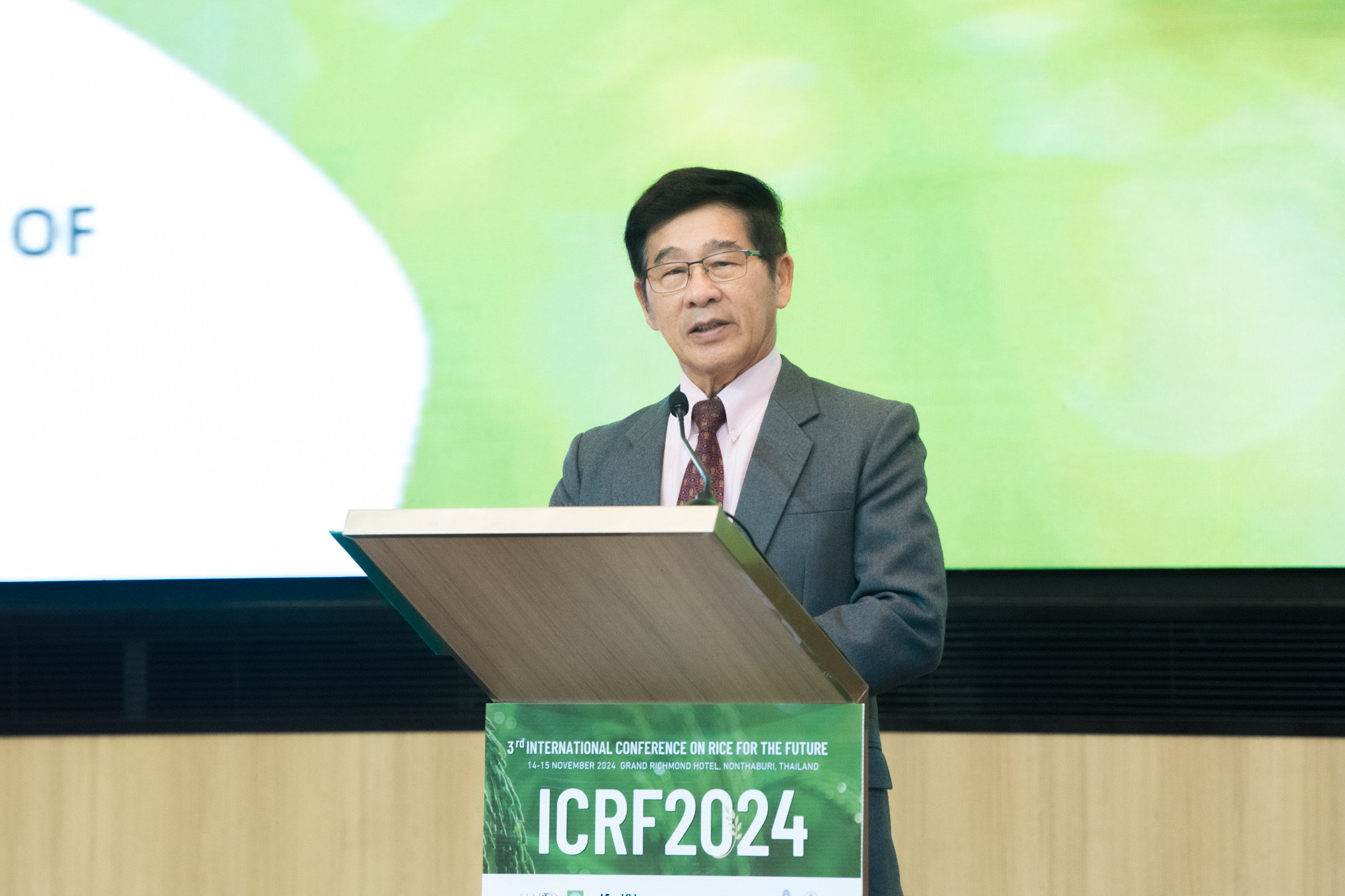 ศ.ดร.ดอกรัก มารอด รองอธิการบดีฝ่ายวิจัยและความเป็นสากลมหาวิทยาลัยเกษตรศาสตร์ กล่าวว่า ICRF 2024 เป็นงานที่รวมบุคคลสำคัญจากทั่วโลกที่มารวมตัวกัน เพื่อแบ่งปันความรู้และข้อมูลเชิงลึกเกี่ยวกับพืชผลที่สำคัญที่สุดนั่นคือ “ข้าว” ปัจจุบันการวิจัยข้าวมีบทบาทสำคัญในการรับมือกับความท้าทายที่เราเผชิญ เช่น การเปลี่ยนแปลงสภาพภูมิอากาศ การขาดแคลนน้ำ และความต้องการผลผลิตที่สูงขึ้นโดยใช้ทรัพยากรน้อยลง โดยมหาวิทยาลัยเกษตรศาสตร์ได้มีส่วนร่วมในการวิจัยและพัฒนาข้าวอย่างต่อเนื่อง ด้วยความร่วมมือกับพันธมิตรทั้งในและต่างประเทศ มีการบุกเบิกพัฒนาพันธุ์ข้าวใหม่ ๆ ที่มีความสามารถในการปรับตัว มีคุณค่าทางโภชนาการ และยั่งยืนต่อสิ่งแวดล้อมมากขึ้น ซึ่งได้บูรณาการเทคโนโลยีสมัยใหม่ เช่น จีโนมิกส์ เกษตรแม่นยำ และเทคโนโลยีชีวภาพ นอกจากนี้ยังสนับสนุนการพัฒนาผลิตภัณฑ์ข้าวเพื่อเพิ่มรายได้ของเกษตรกรและขยายการใช้งานทางอุตสาหกรรม โดยพื้นฐานแล้ว เพื่อปรับปรุงความเป็นอยู่ของเกษตรกรและรับประกันความมั่นคงทางอาหารสำหรับคนรุ่นอนาคต