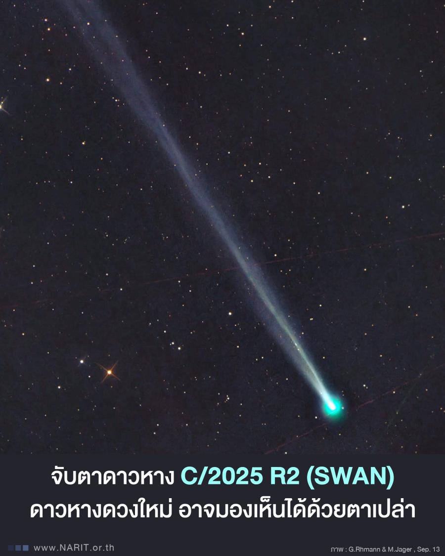 สถาบันวิจัยดาราศาสตร์แห่งชาติ (องค์การมหาชน) (สดร.) หรือ NARIT กระทรวงการอุดมศึกษา วิทยาศาสตร์ วิจัยและนวัตกรรม (อว.) ชวนจับตาดาวหาง C/2025 R2 (SWAN) หรือ SWAN25B ดาวหางดวงใหม่ที่เพิ่งค้นพบ ช่วงนี้สังเกตการณ์ผ่านกล้องสองตาหรือกล้องโทรทรรศน์ได้แล้ว ทางทิศตะวันตก ตั้งแต่หัวค่ำจนถึงเวลาประมาณ 19:50 น. ลุ้นความสว่างเพิ่มขึ้นจนอาจมองเห็นได้ด้วยตาเปล่า