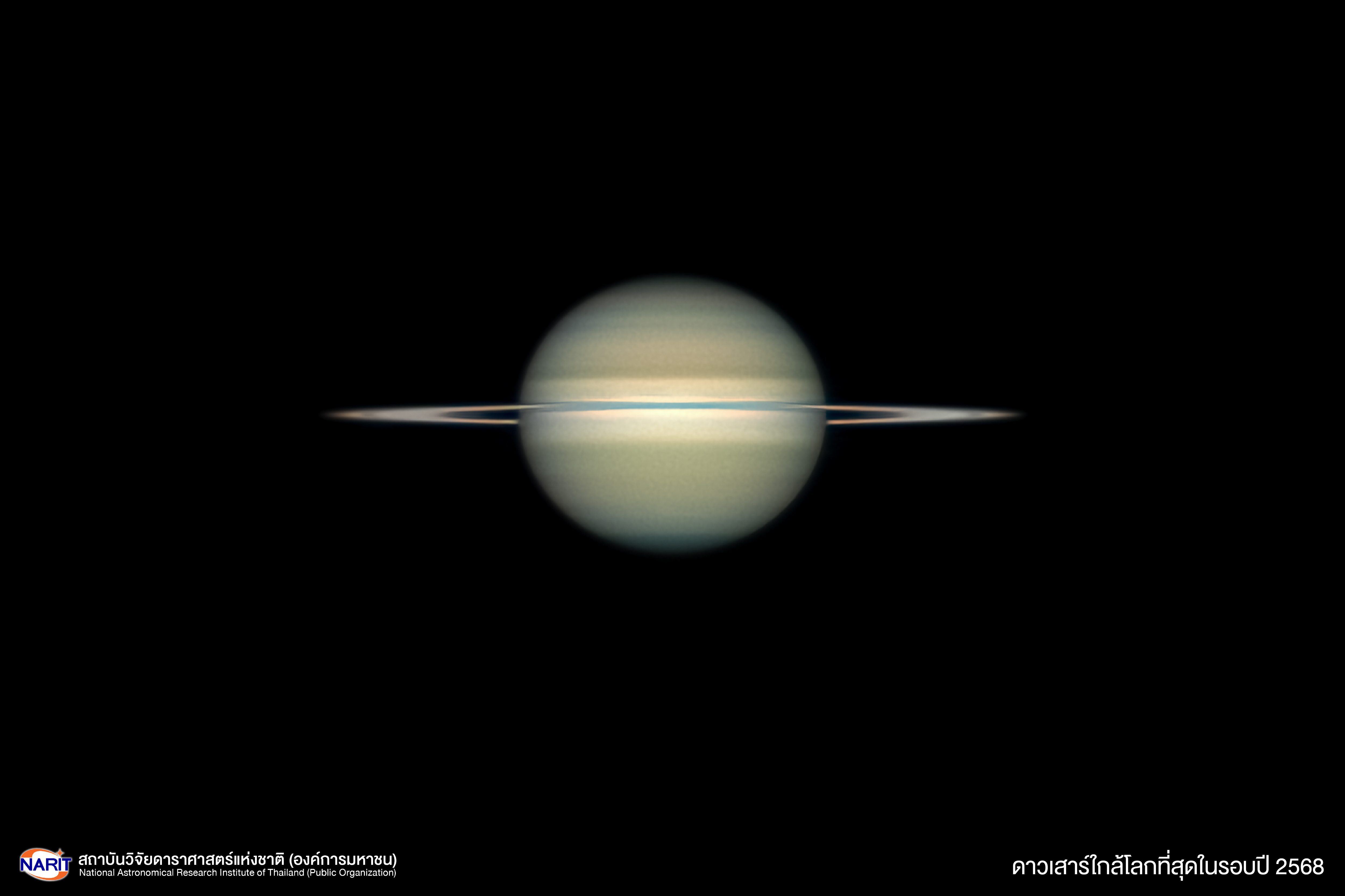 สถาบันวิจัยดาราศาสตร์แห่งชาติ (องค์การมหาชน) (สดร. หรือ NARIT) กระทรวงการอุดมศึกษา วิทยาศาสตร์ วิจัย และนวัตกรรม (อว.) เผยภาพ “ดาวเสาร์ใกล้โลกที่สุดในรอบปี” วันที่ 21 กันยายน 2568 บันทึกโดยกล้องโทรทรรศน์ขนาดเส้นผ่านศูนย์กลาง 0.4 เมตร ณ หอดูดาวเฉลิมพระเกียรติ 7 รอบ พระชนมพรรษา สงขลา เผยให้เห็นวงแหวนดาวเสาร์บางเฉียบ