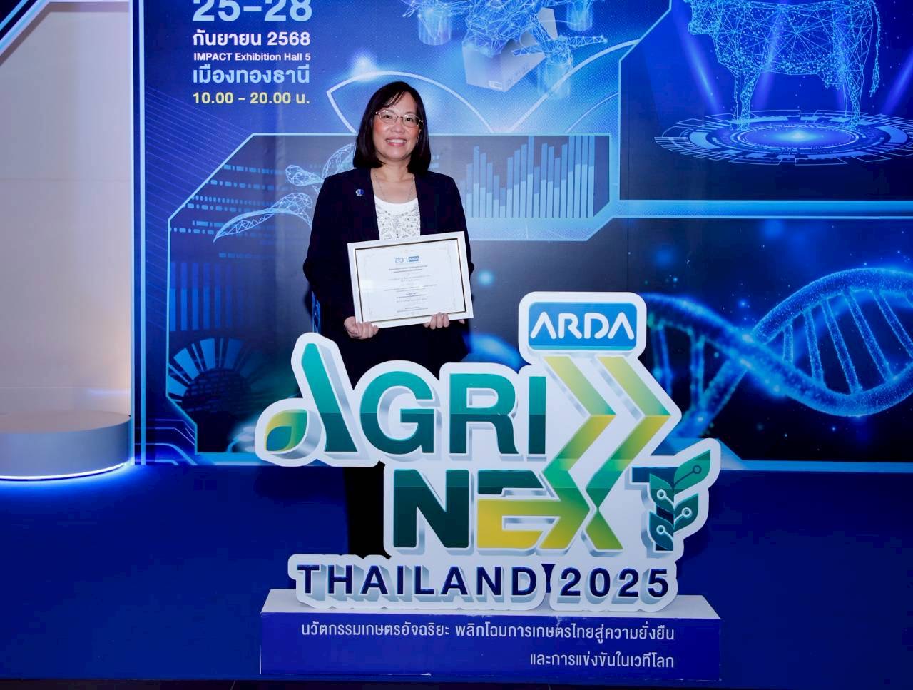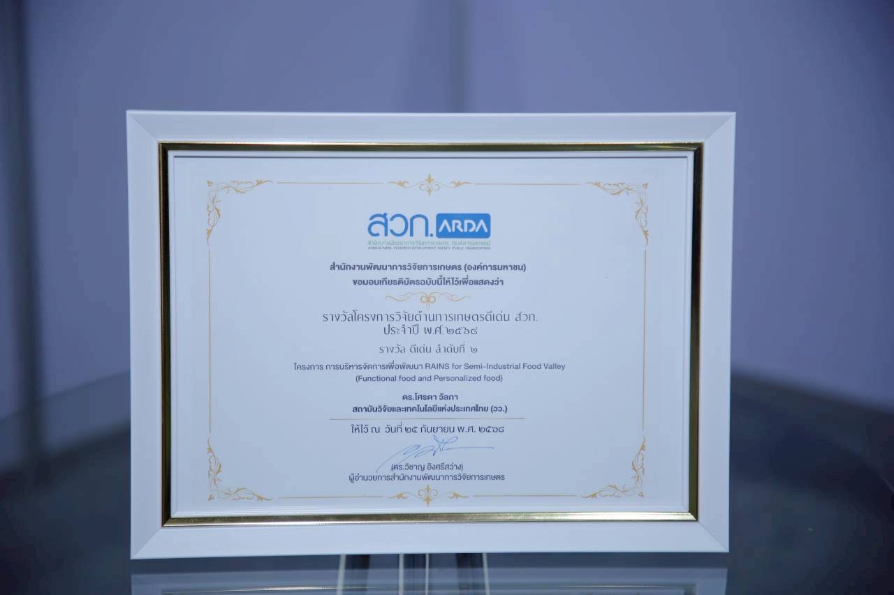ดร.โศรดา วัลภา รองผู้ว่าการบริการอุตสาหกรรม สถาบันวิจัยวิทยาศาสตร์และเทคโนโลยีแห่งประเทศไทย (วว.) กระทรวงการอุดมศึกษา วิทยาศาสตร์ วิจัยและนวัตกรรม (อว.) ในฐานะหัวหน้าโครงการฯ เป็นผู้แทน วว. เข้ารับรางวัลโครงการวิจัยด้านการเกษตรดีเด่น จากผลงานโครงการบริหารจัดการเพื่อพัฒนา RAINS for Semi-Industrial Food Valley (Functional food and Personalized food) ซึ่งได้รับการสนับสนุนทุนวิจัยจาก สำนักงานพัฒนาการวิจัยการเกษตร (องค์การมหาชน) หรือ สวก. และจัดกิจกรรมนี้ขึ้น เนื่องในงานประชุมวิชาการและแสดงผลงานวิจัยและนวัตกรรมด้านการเกษตร ภายใต้หัวข้อ “นวัตกรรมเกษตรอัจฉริยะ : พลิกโฉมการเกษตรไทยสู่ความยั่งยืนและการแข่งขันในเวทีโลก” เพื่อเชิดชูเกียรติและเป็นกำลังใจแก่ผู้ผลิตผลงานวิจัยที่มีคุณภาพและสร้างผลกระทบเชิงประจักษ์ต่อภาคการเกษตร รวมทั้งเป็นเวทีแลกเปลี่ยนองค์ความรู้ เทคโนโลยีและนวัตกรรม ระหว่างนักวิจัย เกษตรกร ผู้ประกอบการ และหน่วยงานที่เกี่ยวข้อง ในการนี้ นายตรันต์ สิริกาญจน ผอ.กองสื่อสารภายใน สำนักสื่อสารองค์กร ในฐานะคณะทำงานโครงการฯ ผู้ประกอบการ บุคลากร วว. เข้าร่วมเป็นเกียรติและจัดแสดงนิทรรศการผลงานด้วย ในวันที่ 26 กันยายน 2568 ณ อิมแพค เมืองทองธานี