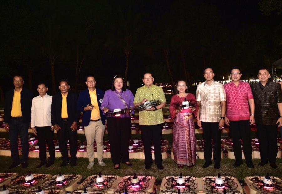 ในการนี้ การแสดงบินโดรนเป็นการกระตุ้นการท่องเที่ยว ในครั้งนี้ได้จัดแสดงบินโดรนแปรอักษรมากกว่า 500 ลำ ซึ่งมีการจัดแสดงประกอบด้วยภาพพระนามาภิไธยย่อ วปร ภาพในหลวงรัชกาลที่ 10 ภาพ Logo อุทยานพระบรมราชานุสรณ์ สมเด็จพระพุทธเลิศหล้านภาลัย ภาพรัชกาลที่ 2 ภาพทรงพระเจริญ ภาพตลาดร่มหุบ ภาพตลาดน้ำอัมพวา ภาพกระทงกาบกล้วย ภาพหมูเด้งถือกระทงกาบกล้วย ภาพ Logo อว. วช. ภาพ Logo จังหวัดสมุทรสงคราม ภาพ Logo เทศบาลจังหวัดสมุทรสงคราม และภาพ Logo Amazing Thailand