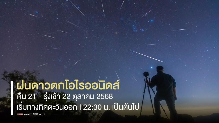 สถาบันวิจัยดาราศาสตร์แห่งชาติ (องค์การมหาชน) (NARIT) กระทรวงการอุดมศึกษา วิทยาศาสตร์ วิจัย และนวัตกรรม (อว.) เผยมีปรากฏการณ์ “ฝนดาวตกโอไรออนิดส์” คืน 21 ต.ค. 68 ตั้งแต่ 22:30 น. จนถึงรุ่งเช้าอีกวัน ปีนี้ไร้แสงจันทร์รบกวน หากฟ้าใสไร้ฝน ลุ้นชมด้วยตาเปล่าได้ทั่วประเทศ