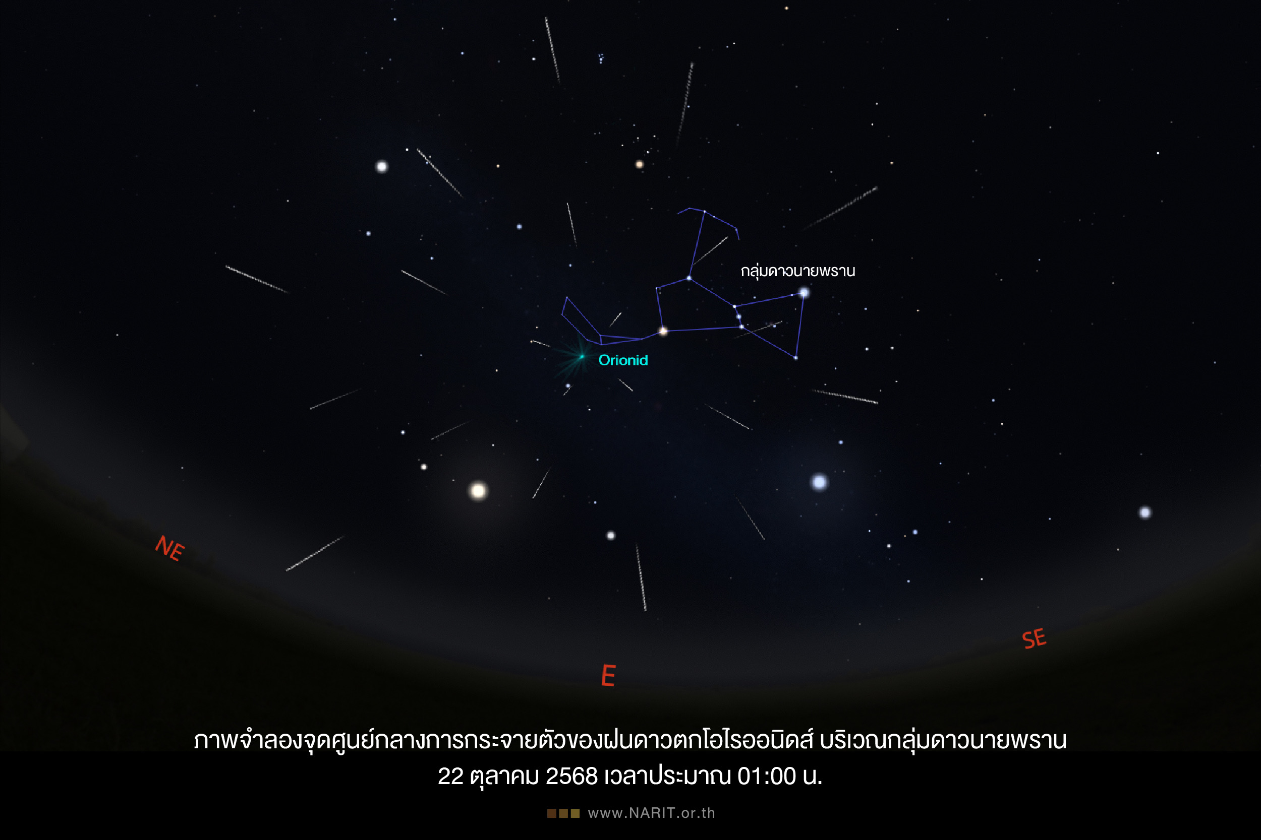 นายศุภฤกษ์ คฤหานนท์ ผู้ช่วยผู้อำนวยการสถาบันวิจัยดาราศาสตร์แห่งชาติ เปิดเผยว่า “ฝนดาวตกโอไรออนิดส์” หรือฝนดาวตกในกลุ่มดาวนายพราน จะเกิดขึ้นในช่วงวันที่ 2 ตุลาคม ถึง 7 พฤศจิกายน ของทุกปี สำหรับในปี 2568 คาดว่ามีอัตราการตกสูงสุดเฉลี่ยประมาณ 20 ดวงต่อชั่วโมง ในคืน 21 ต่อเนื่องถึงรุ่งเช้า 22 ตุลาคม 2568 เริ่มสังเกตการณ์ได้ตั้งแต่เวลาประมาณ 22:30 น. ของวันที่ 21 ตุลาคม โดยจุดศูนย์กลางการกระจายตัวของฝนดาวตกจะอยู่บริเวณแขนของกลุ่มดาวนายพราน ปรากฏขึ้นทางทิศตะวันออก จากนั้นจะค่อย ๆ เคลื่อนสูงขึ้นสู่บริเวณกลางท้องฟ้า และสามารถเฝ้าชมได้ตลอดทั้งคืนจนถึงรุ่งเช้า