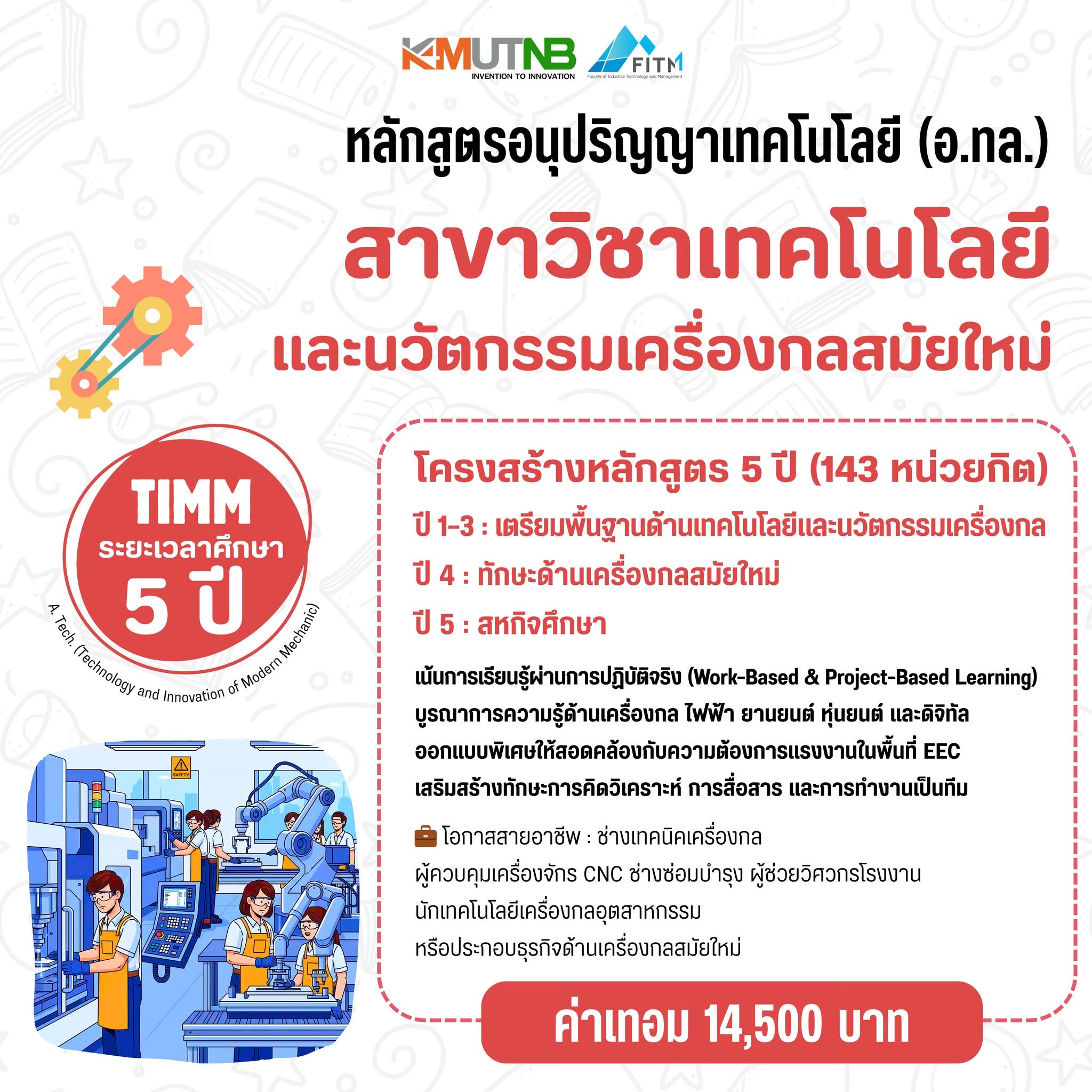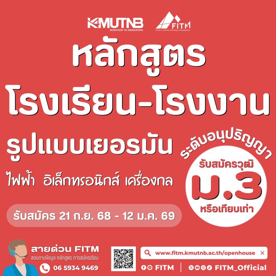 คณะเทคโนโลยีและการจัดการอุตสาหกรรม (FITM ) มหาวิทยาลัยเทคโนโลยีพระจอมเกล้าพระนครเหนือ วิทยาเขตปราจีนบุรี เปิดรับสมัครนักศึกษาในโครงการรับสมัครคัดเลือกเข้าศึกษา “หลักสูตรโรงเรียน-โรงงาน” สำหรับผู้มีวุฒิ ม.3 หรือเทียบเท่า เปิดรับสมัคร วันที่ 21 กันยายน 2568-12 มกราคม 2569