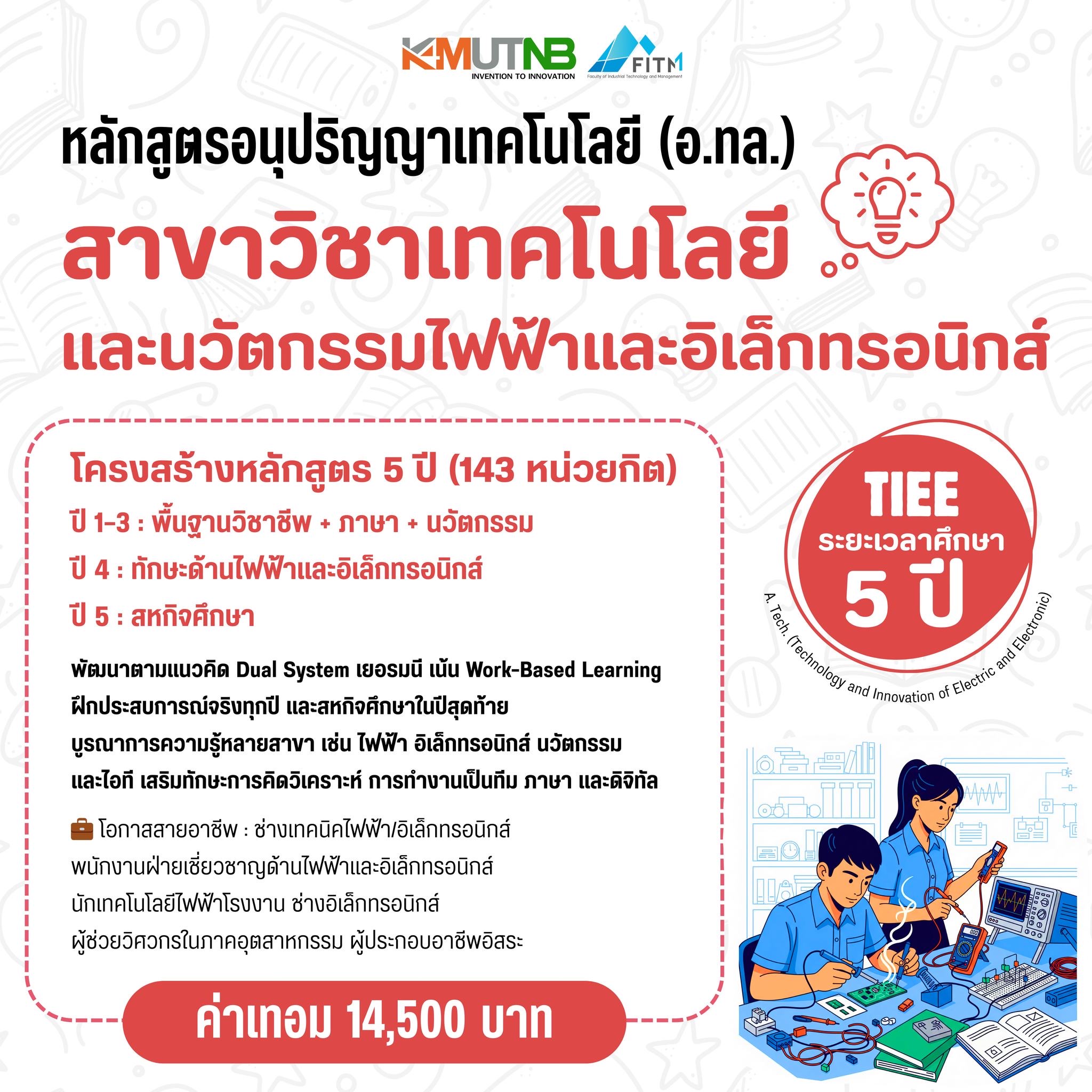 ผู้เรียนได้ทั้งความรู้ ทักษะ และประสบการณ์ตรงจากสถานประกอบการ และเรียนควบคู่การปฏิบัติจริง (Work-Based Learning) จ่ายค่าเทอมเพียง 14500 บาท