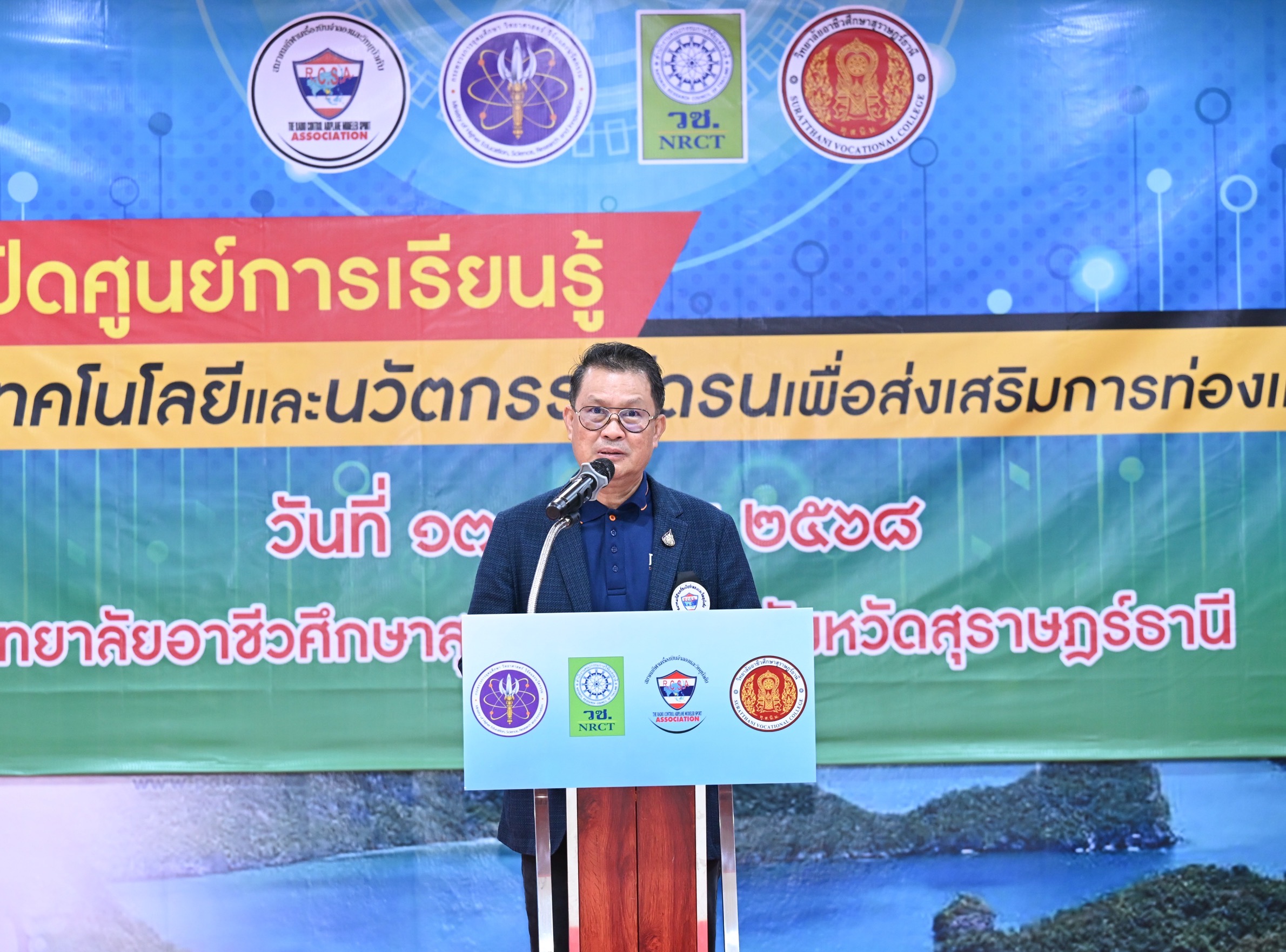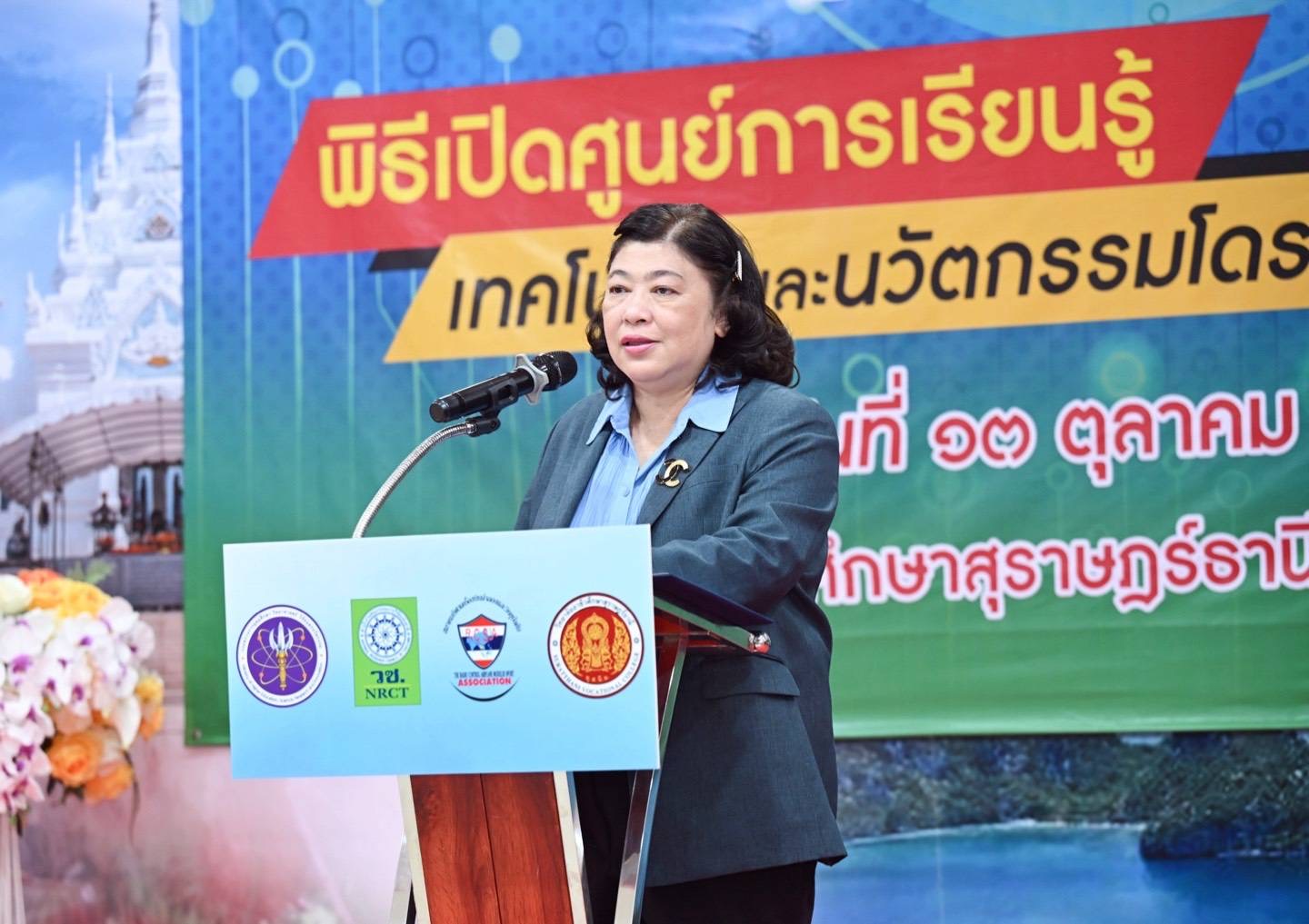 ดร.วิภารัตน์ ดีอ่อง ผู้อำนวยการสำนักงานการวิจัยแห่งชาติ กล่าวว่า วช. ได้สนับสนุนการจัดตั้งศูนย์การเรียนรู้เทคโนโลยีและนวัตกรรมโดรนฯขึ้น เพื่อเป็นศูนย์สำคัญในการนำองค์ความรู้ด้านวิทยาศาสตร์ วิจัย และนวัตกรรม มาบูรณาการเพื่อพัฒนาท้องถิ่น โดยเฉพาะการใช้เทคโนโลยีโดรนในการส่งเสริมการท่องเที่ยว สร้างสื่อประชาสัมพันธ์ รวมถึงการสำรวจพื้นที่เพื่อการพัฒนาเชิงอนุรักษ์และยั่งยืน นอกจากนี้ ศูนย์ฯ ยังเป็นพื้นที่แห่งการเรียนรู้สำหรับเยาวชนในระดับอาชีวศึกษา เพื่อเสริมสร้างทักษะด้านเทคโนโลยี การคิดเชิงสร้างสรรค์ และการนำนวัตกรรมไปใช้ประโยชน์จริง ซึ่งจะช่วยเพิ่มขีดความสามารถในการแข่งขันของประเทศ และสนับสนุนให้เกิดการพัฒนาชุมชนอย่างต่อเนื่อง วช. ขอยกย่องความร่วมมือของ สำนักงานคณะกรรมการการอาชีวศึกษา และ วิทยาลัยอาชีวศึกษาสุราษฎร์ธานี ที่ได้ร่วมกันเปิดพื้นที่แห่งโอกาสทางการเรียนรู้ด้านเทคโนโลยีโดรน เพื่อสร้างแรงบันดาลใจให้เยาวชนรุ่นใหม่ก้าวทันต่อการเปลี่ยนแปลงของโลกยุคดิจิทัลและเชื่อมั่นว่าศูนย์ฯ แห่งนี้จะเป็นต้นแบบของการใช้วิจัยและนวัตกรรมเพื่อพัฒนาท้องถิ่นและการท่องเที่ยวต่อไป
