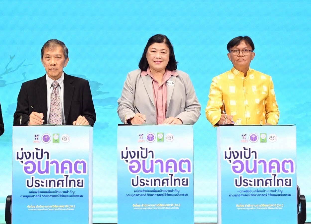 วันที่ 14 ตุลาคม 2568 สำนักงานการวิจัยแห่งชาติ (วช.) กระทรวงการอุดมศึกษา วิทยาศาสตร์ วิจัยและนวัตกรรม ร่วมกับจังหวัดสงขลาและภาคีเครือข่ายในพื้นที่ จัดพิธีลงนามบันทึกข้อตกลงความร่วมมือกิจกรรม “มุ่งเป้าอนาคตประเทศไทย น้ำมั่นคง ไม่ท่วม ไม่แล้ง” เพื่อขับเคลื่อนเป้าหมายสำคัญตามยุทธศาสตร์ ววน. โดย ดร.วิภารัตน์ ดีอ่อง ผู้อำนวยการสำนักงานการวิจัยแห่งชาติ เป็นประธานในพิธี กล่าวเปิดงานและร่วมลงนาม พร้อมด้วย นางสาวเสาวนีย์ มุ่งสุจริตการ รองผู้อำนวยการสำนักงานการวิจัยแห่งชาติ และคณะผู้บริหาร วช. เข้าร่วม ซึ่งมี นายธราวุธ ช่วยเกิด รองผู้ว่าราชการจังหวัด รักษาราชการแทนผู้ว่าราชการจังหวัดพัทลุง รวมถึงหน่วยงานภาครัฐ ภาคเอกชน และภาคประชาสังคม จากจังหวัดสงขลาและจังหวัดพัทลุงกว่า 15 หน่วยงาน เข้าร่วมลงนามและร่วมแสดงเจตนารมณ์ในการขับเคลื่อนความร่วมมือดังกล่าว ณ โรงแรมลีการ์เดนส์พลาซ่า อำเภอหาดใหญ่ จังหวัดสงขลา