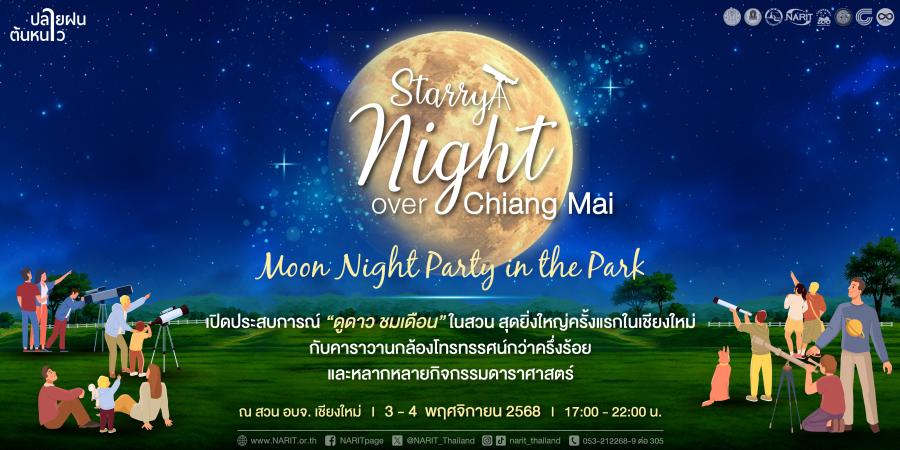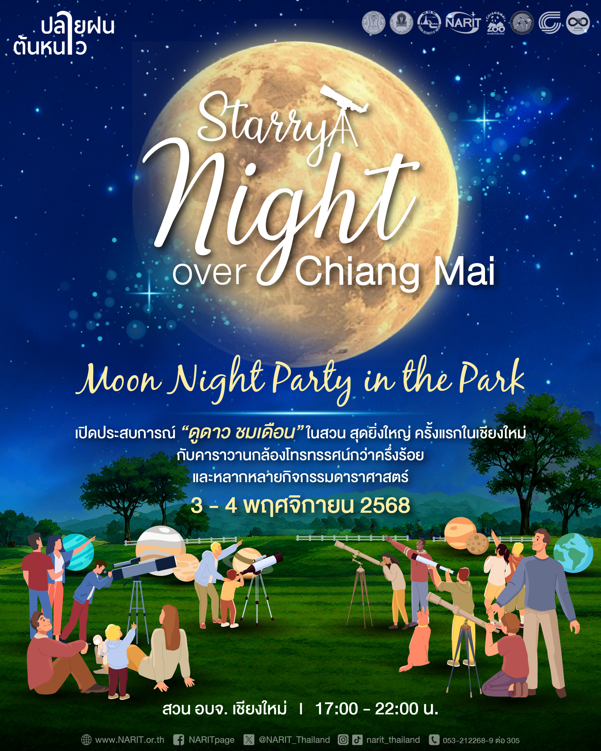 สำหรับวันที่ 3 - 4 พฤศจิกายน 2568 นี้ นับเป็นครั้งแรกที่จะร่วมกับจังหวัดเชียงใหม่ และองค์การบริหารส่วนจังหวัดเชียงใหม่ จัดงานดูดาวครั้งยิ่งใหญ่ “Starry Night over Chiang Mai” ดูดาว ชมเดือน ณ ใจกลางสวน อบจ. เชียงใหม่ พบกับคาราวานกล้องโทรทรรศน์หลายชนิดกว่า 50 ตัวจาก NARIT พร้อมด้วยเครือข่ายโรงเรียนดาราศาสตร์ และเครือข่ายนักดาราศาสตร์สมัครเล่น ทั้งในจังหวัดเชียงใหม่และใกล้เคียง ที่จะยกทัพมาร่วมกันตั้งกล้องดูดาวให้ชาวเชียงใหม่ได้ส่องชมวัตถุท้องฟ้าในคืนนั้น อาทิ ดวงจันทร์ ดาวเสาร์ กระจุกดาวลูกไก่ เนบิวลาสว่างใหญ่ กาแล็กซีแอนโดรเมดา ฯลฯ นอกจากนี้ ยังมีกิจกรรมอื่น ๆ ให้ร่วมสนุกและเรียนรู้กันอีกมากมาย อาทิ ถ่ายภาพวัตถุท้องฟ้าผ่านโทรศัพท์มือถือ รู้จักท้องฟ้าและกลุ่มดาวที่น่าสนใจผ่านแอปพลิเคชันดูดาวฝีมือคนไทย “NAPA Star Map” เก็บภาพความประทับใจกับคาราวานบอลลูนดาวเคราะห์ทั้งระบบสุริยะกลางสวน รู้จักกลุ่มดาวผ่านการประดิษฐ์กล่องไฟ Stellar Light Box ท่องโซนเรืองแสง Glow in the Dark และฟัง Special Talk “ไขความลับบนดวงจันทร์” พร้อมกันภายใต้แสงจันทร์ พิเศษ ! ลุ้นรับกล้องโทรทรรศน์กลับบ้าน และของที่ระลึกสุดพิเศษภายในงาน