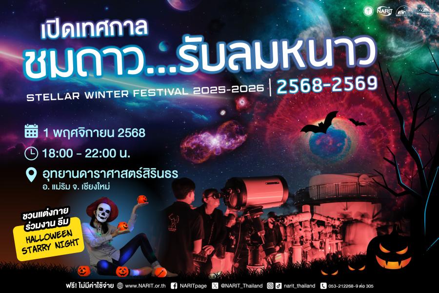 สถาบันวิจัยดาราศาสตร์แห่งชาติ (องค์การมหาชน) (สดร. หรือ NARIT) กระทรวงการอุดมศึกษา วิทยาศาสตร์ วิจัยและนวัตกรรม (อว.) ชวนคนไทยดูดาวหนาวนี้ เริ่มอีเวนต์แรก 1 พฤศจิกายน 2568 “เปิดเทศกาลชมดาว…รับลมหนาว” ดูดาวทุกคืนวันเสาร์ พร้อมกัน 5 แห่ง ได้แก่ อุทยานดาราศาสตร์สิรินธร อ. แม่ริม จ. เชียงใหม่ และหอดูดาวเฉลิมพระเกียรติฯ นครราชสีมา ขอนแก่น ฉะเชิงเทรา และสงขลา พร้อมเปิดโผ 10 อีเวนต์ดาราศาสตร์ที่น่าสนใจตลอดช่วงฤดูหนาวนี้