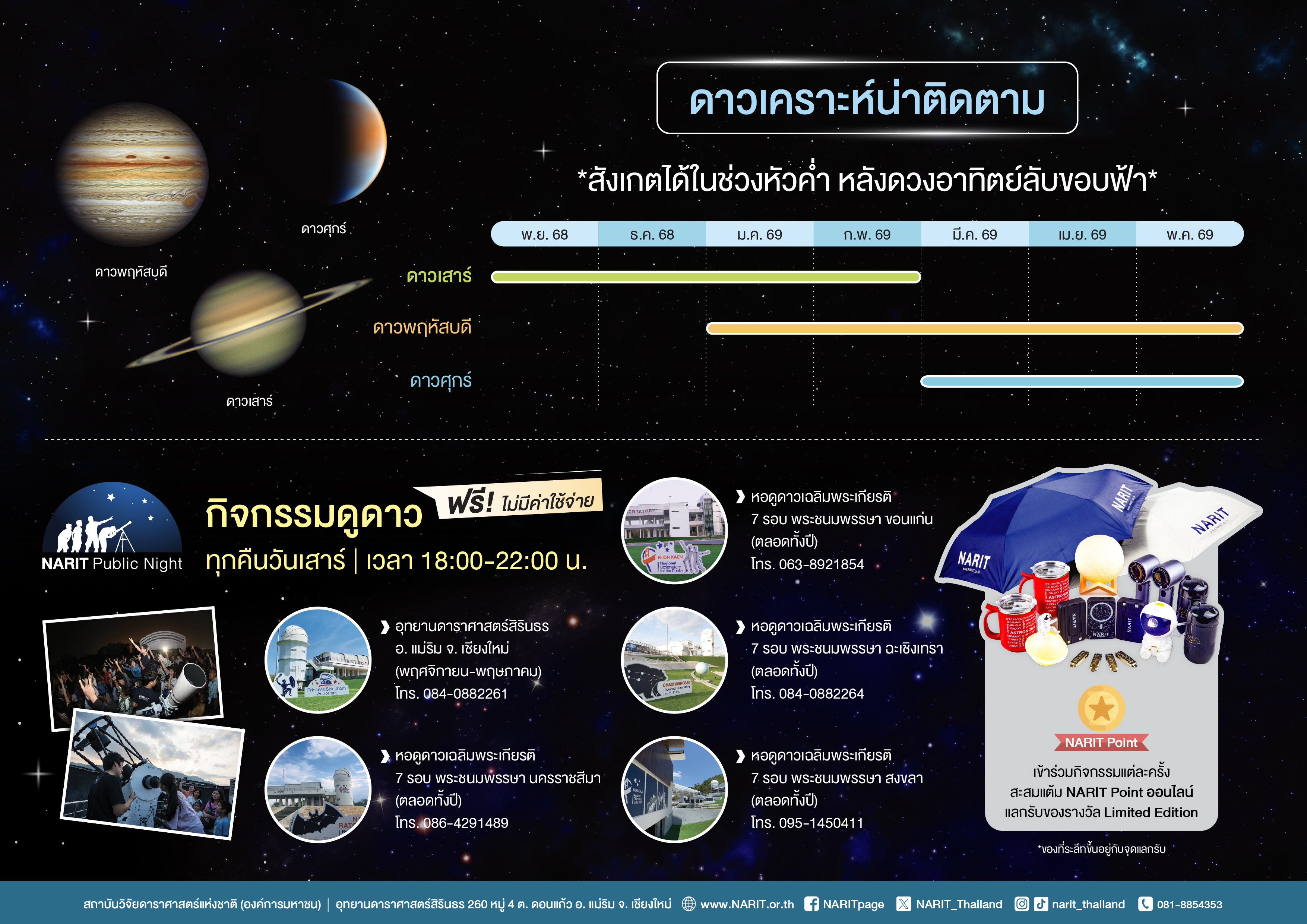 นายศุภฤกษ์ คฤหานนท์ ผู้ช่วยผู้อำนวยการสถาบันวิจัยดาราศาสตร์แห่งชาติ เปิดเผยว่า ช่วงเวลาที่เหมาะสมแก่การดูดาวของประเทศไทยที่สุดคือช่วงฤดูหนาว โดยเฉพาะอย่างยิ่งในเขตภาคเหนือ ซึ่ง NARIT ได้กำหนดให้ช่วงดังกล่าวเป็น “เทศกาลชมดาว” เป็นประจำทุกปี ปีนี้จะเริ่มในวันเสาร์ที่ 1 พฤศจิกายน 2568 โดยจะเปิดให้ชมดาวทุกคืนวันเสาร์อีกครั้ง ณ อุทยานดาราศาสตร์สิรินธร อ. แม่ริม จ. เชียงใหม่ ไปจนถึงช่วงเดือนพฤษภาคม 2569 สำหรับหอดูดาวเฉลิมพระเกียรติฯ นครราชสีมา ขอนแก่น ฉะเชิงเทรา และสงขลา เปิดให้บริการตามปกติเช่นเดิม เพิ่มเติมคือพาเหรด 10 กิจกรรมดาราศาสตร์สุดพิเศษตลอดฤดูกาล เข้าร่วมฟรี ไม่มีค่าใช้จ่าย ดังนี้
