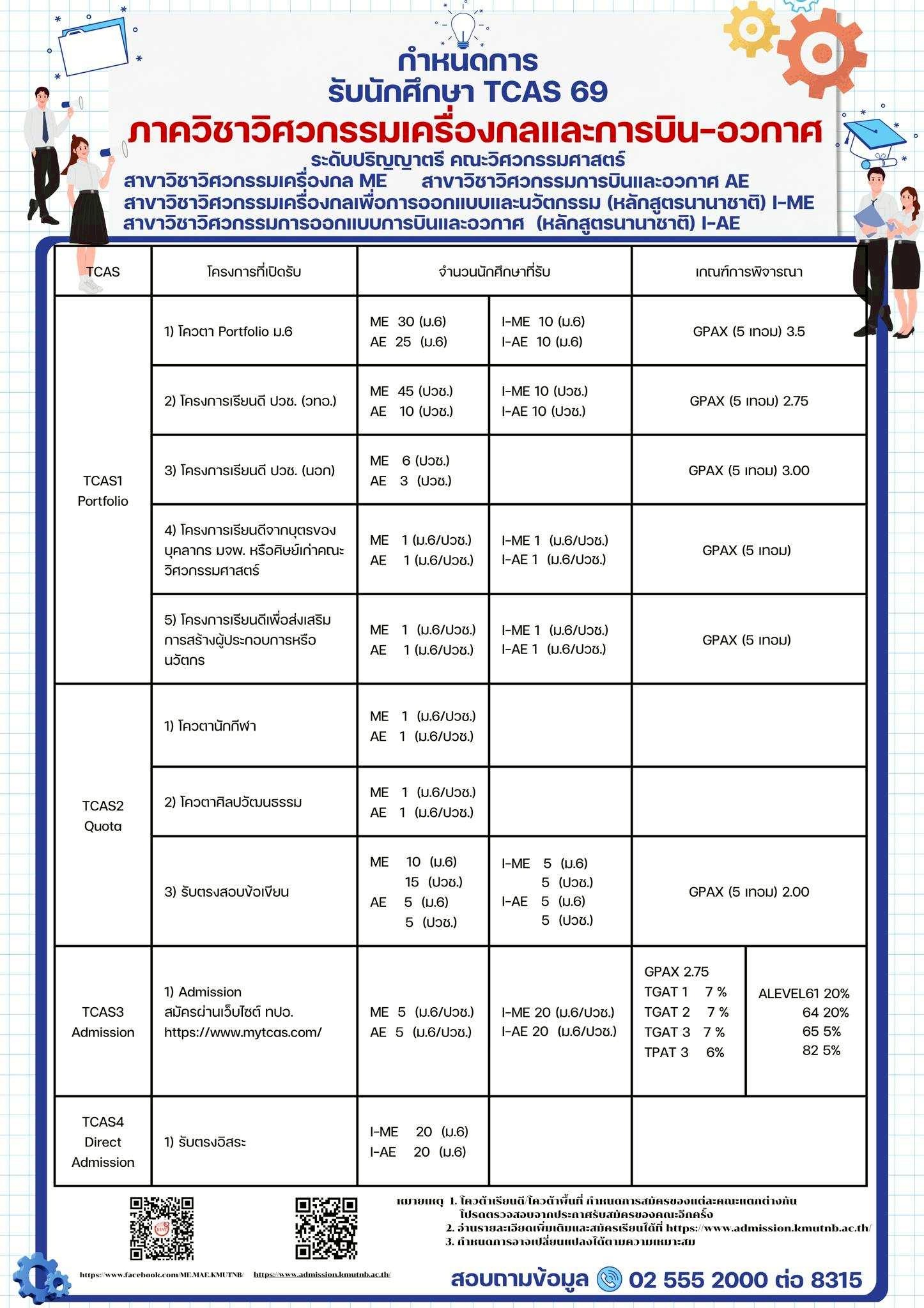 ภาควิชาวิศวกรรมเครื่องกลและการบิน-อวกาศ คณะวิศวกรรมศาสตร์ มหาวิทยาลัยเทคโนโลยีพระจอมเกล้าพระนครเหนือ (มจพ.) เปิดรับสมัครนักศึกษา TCAS69 เข้าศึกษาต่อในระดับปริญญาตรี ใน 4 สาขาวิชา ได้แก่ 1) สาขาวิชาวิศวกรรมเครื่องกล ME 2) สาขาวิชาวิศวกรรมการบินและอวกาศ AE 3)สาขาวิชาวิศวกรรมเครื่องกลเพื่อการออกแบบและนวัตกรรม (หลักสูตรนานาชาติ) I-ME และ4) สาขาวิชาวิศวกรรมการออกแบบการบินและอวกาศ (หลักสูตรนานาชาติ) I-AE