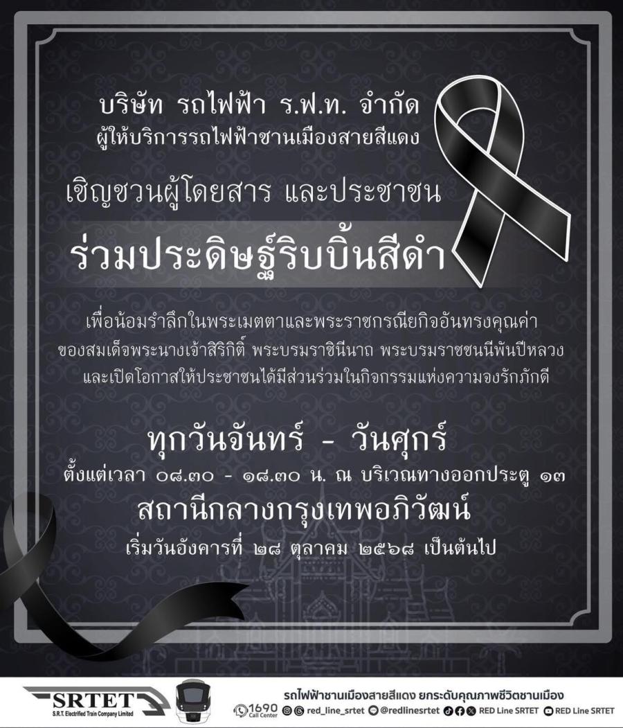 นายสุเทพ พันธุ์เพ็ง กรรมการผู้อำนวยการใหญ่ บริษัท รถไฟฟ้า ร.ฟ.ท. จำกัด ผู้ให้บริการรถไฟฟ้าชานเมืองสายสีแดง เปิดเผยว่า รฟฟท. ถือเป็นหน่วยงานที่รับใช้ใต้เบื้องพระยุคลบาท และน้อมนำแนวพระราชดำริ พระราชปณิธาน และพระบรมราโชบายของพระบาทสมเด็จพระบรมชนกาธิเบศร มหาภูมิพลอดุลยเดชมหาราช บรมนาถบพิตร และสมเด็จพระนางเจ้าสิริกิติ์ พระบรมราชินีนาถ พระบรมราชชนนีพันปีหลวง มาอย่างยาวนาน ในโอกาสนี้จึงขอเชิญชวนผู้โดยสาร และประชาชนทั่วไป ร่วมประดิษฐ์ริบบิ้นสีดำ เพื่อแสดงออกถึงความจงรักภักดี น้อมรำลึกในพระเมตตาและพระราชกรณียกิจอันทรงคุณค่า ของสมเด็จพระนางเจ้าสิริกิติ์ พระบรมราชินีนาถ พระบรมราชชนนีพันปีหลวง โดยสามารถเข้าร่วมประดิษฐ์ริบบิ้นสีดำ ได้ทุกวันจันทร์ - วันศุกร์ เริ่มวันอังคารที่ 28 ตุลาคม 2568 เป็นต้นไป ตั้งแต่เวลา 08.30 - 18.30 น. ณ บริเวณทางออกประตู 13 สถานีกลางกรุงเทพอภิวัฒน์