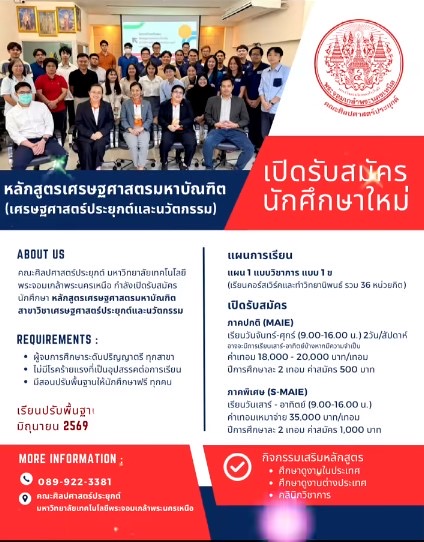 โอกาสเรียนต่อ มจพ. เรียนได้ทุกสายงาน หลักสูตรเศรษฐศาสตรมหาบัณฑิต สาขาวิชาเศรษฐศาสตร์ประยุกต์และนวัตกรรม คณะศิลปศาสตร์ประยุกต์ เลือกได้ทั้งภาคปกติ (จ.-ศ.) และภาคพิเศษ (เสาร์-อาทิตย์ Block Course) พร้อมสอนปรับพื้นฐานฟรี! รับสมัครตั้งแต่บัดนี้ – 31 มกราคม 2569